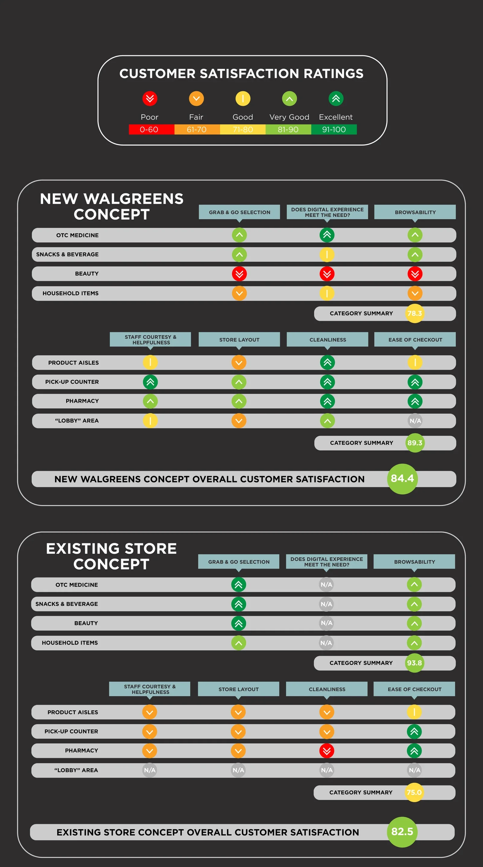 We found that overall, the new store concept scored slightly higher in customer satisfaction. The fresh look and feel more than compensate for the lack of browsability. One area that Walgreen's new concept fell short on is the beauty aisle. Several customers commented that they preferred to browse beauty products in person, rather than digitally, and the limited on-shelf selection was a turn-off.