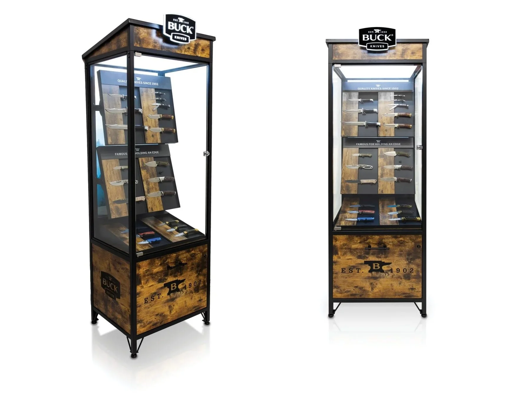 Buck Knives had gone over a decade without updating their POP displays. The challenge was to refresh the brand while maintaining its authenticity. We developed a comprehensive display system, including floor displays, counter displays, and premium under-counter displays. The design incorporates wood finishes that evoke the brand's rugged, outdoorsy spirit, staying true to Buck Knives' deep Idaho roots.