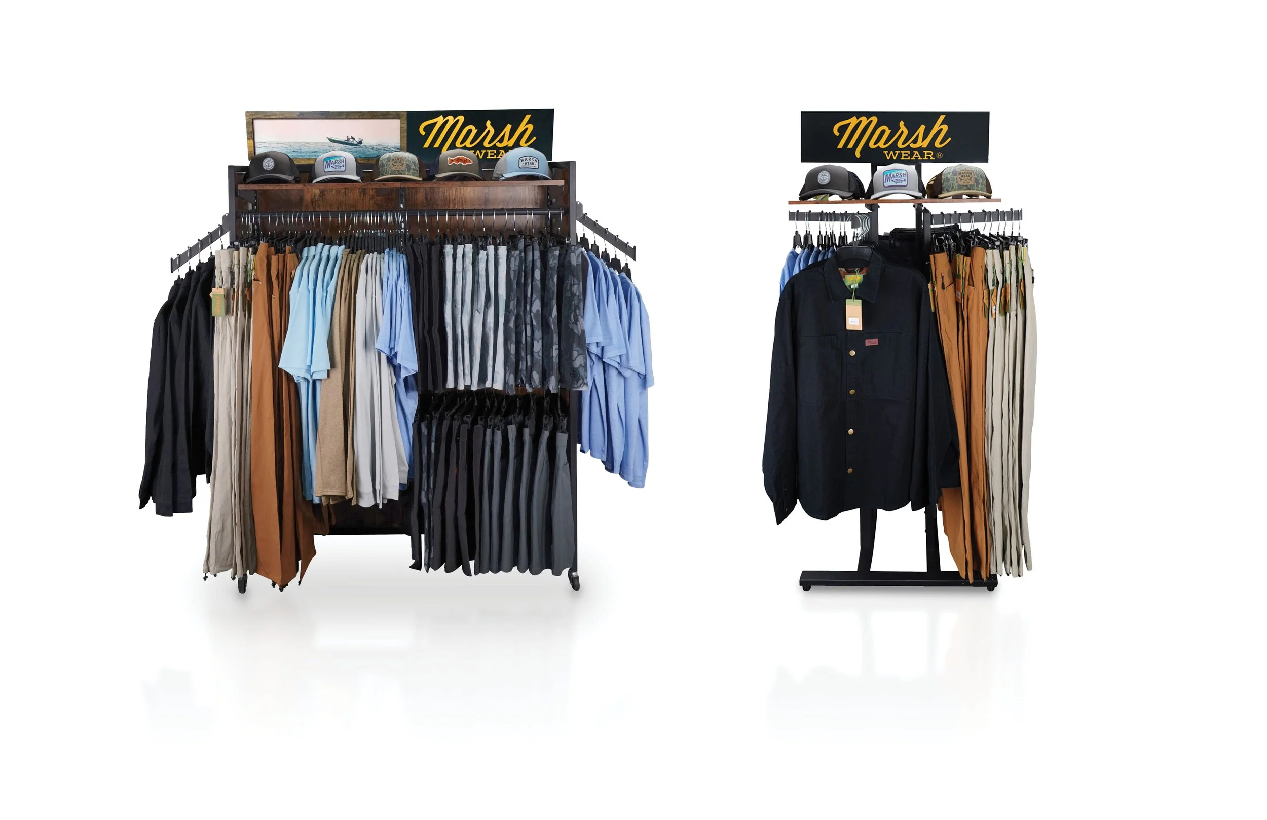 The Marsh Wear display program marks a significant milestone as the brand launches its inaugural comprehensive program. Each element is meticulously designed to seamlessly integrate into a cohesive unit, catering to individual retailer needs within an integrated in-store shop-in-shop experience.