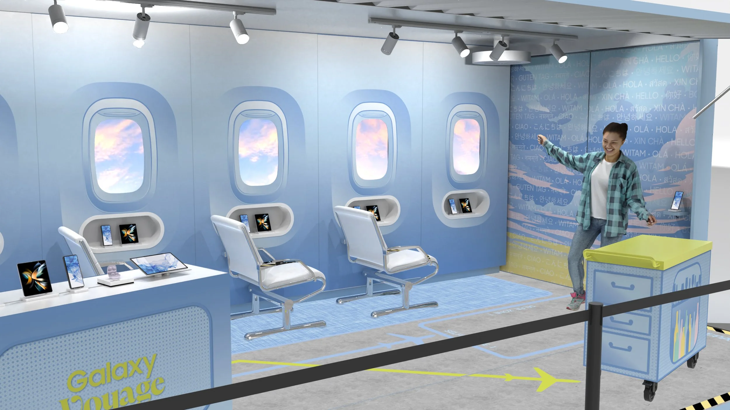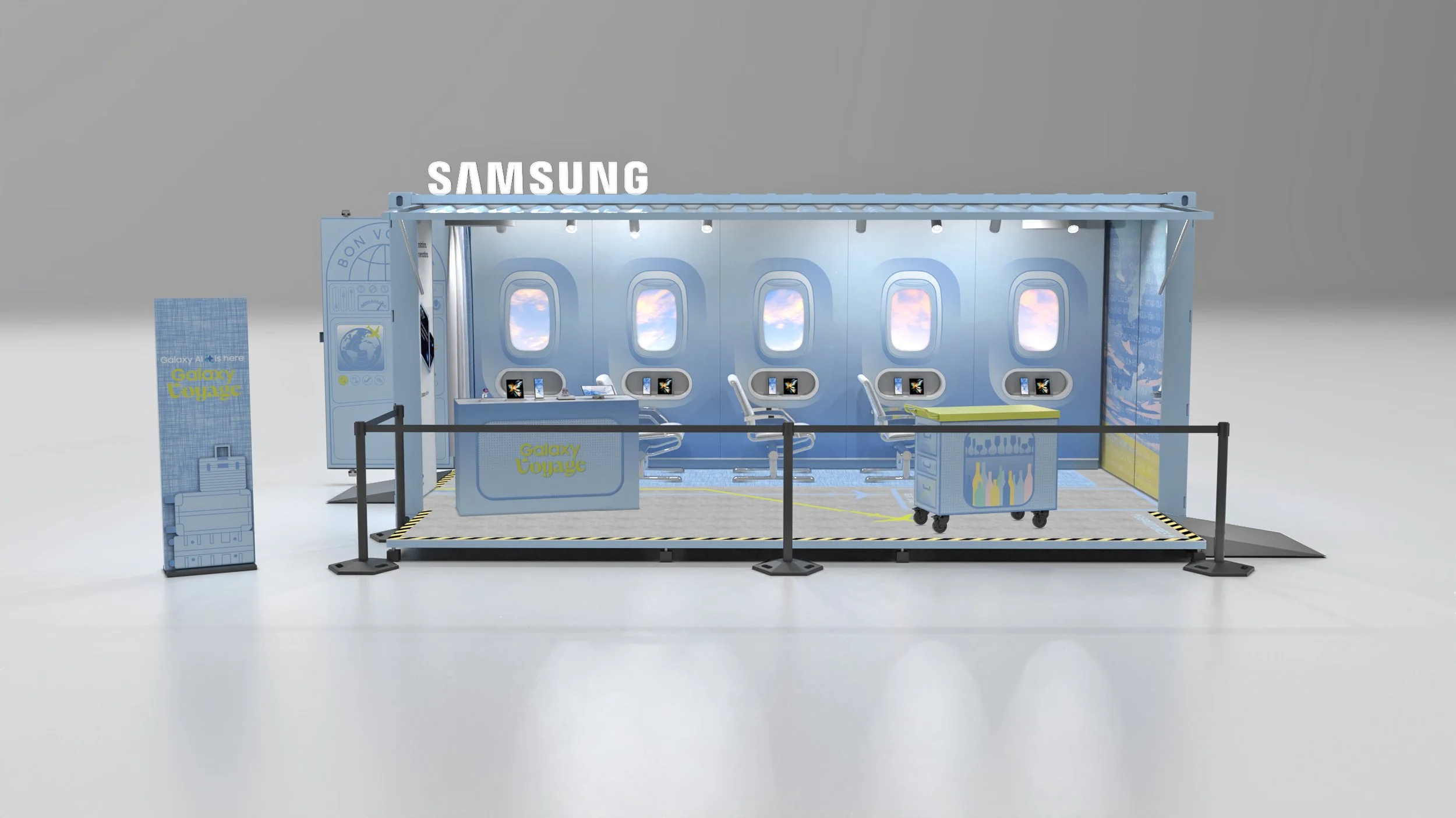 Samsung partnered with Innovative to create this travel-themed activation showcasing the latest Samsung AI tools and devices. We up-cycled a shipping container and transformed the interior to resemble an airplane cabin, complete with airplane seats and a beverage cart filled with Samsung-branded SWAG. Each seat featured digital screens and Samsung devices, inviting guests to embark on an interactive journey powered by the latest in AI technology.