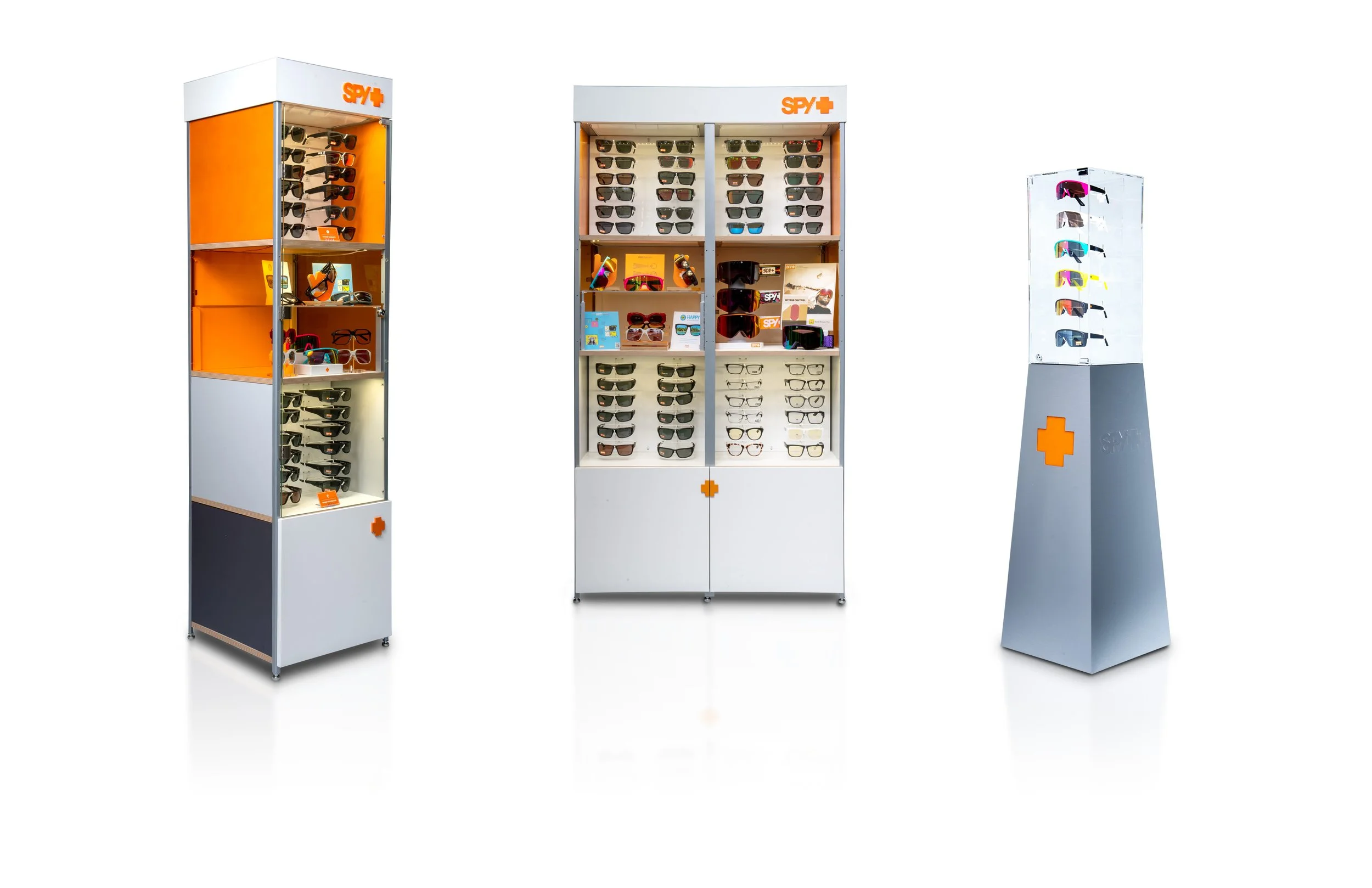 The Spy Beacon display is ideal for larger retail spaces. It accommodates both sunglasses and ski goggles, with two fully telescoping lower shelves that provide additional storage for extra inventory.